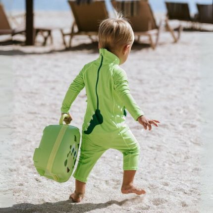 My Little Swimsuit Kupaći je zaštitni kupaći kostim za djecu s UPF50+ zaštitom, visokim ovratnikom i kačketom s vizirom – savršen za sigurno ljetno plivanje i igru.