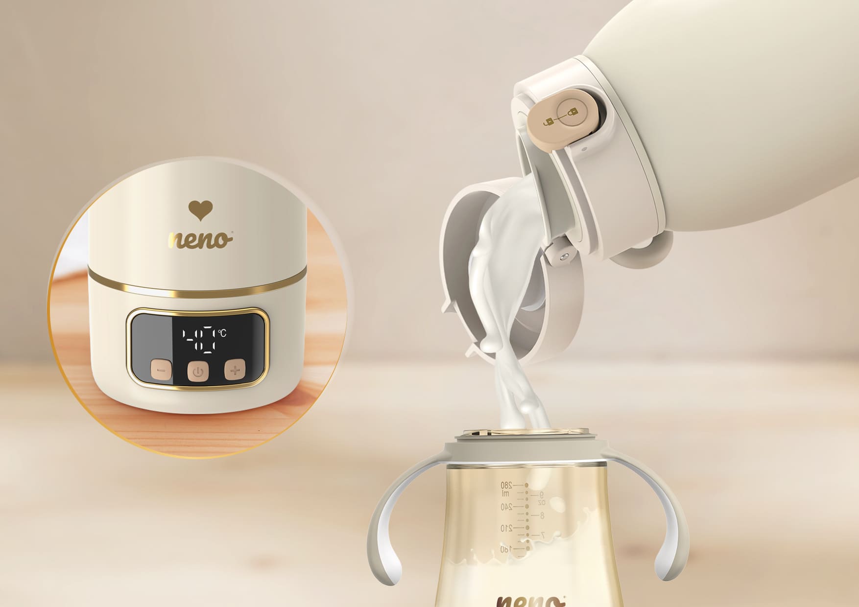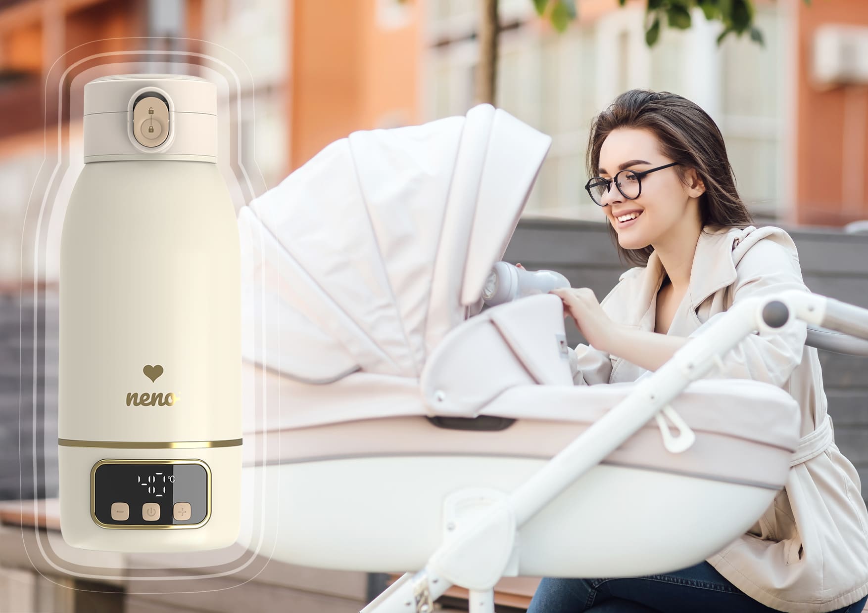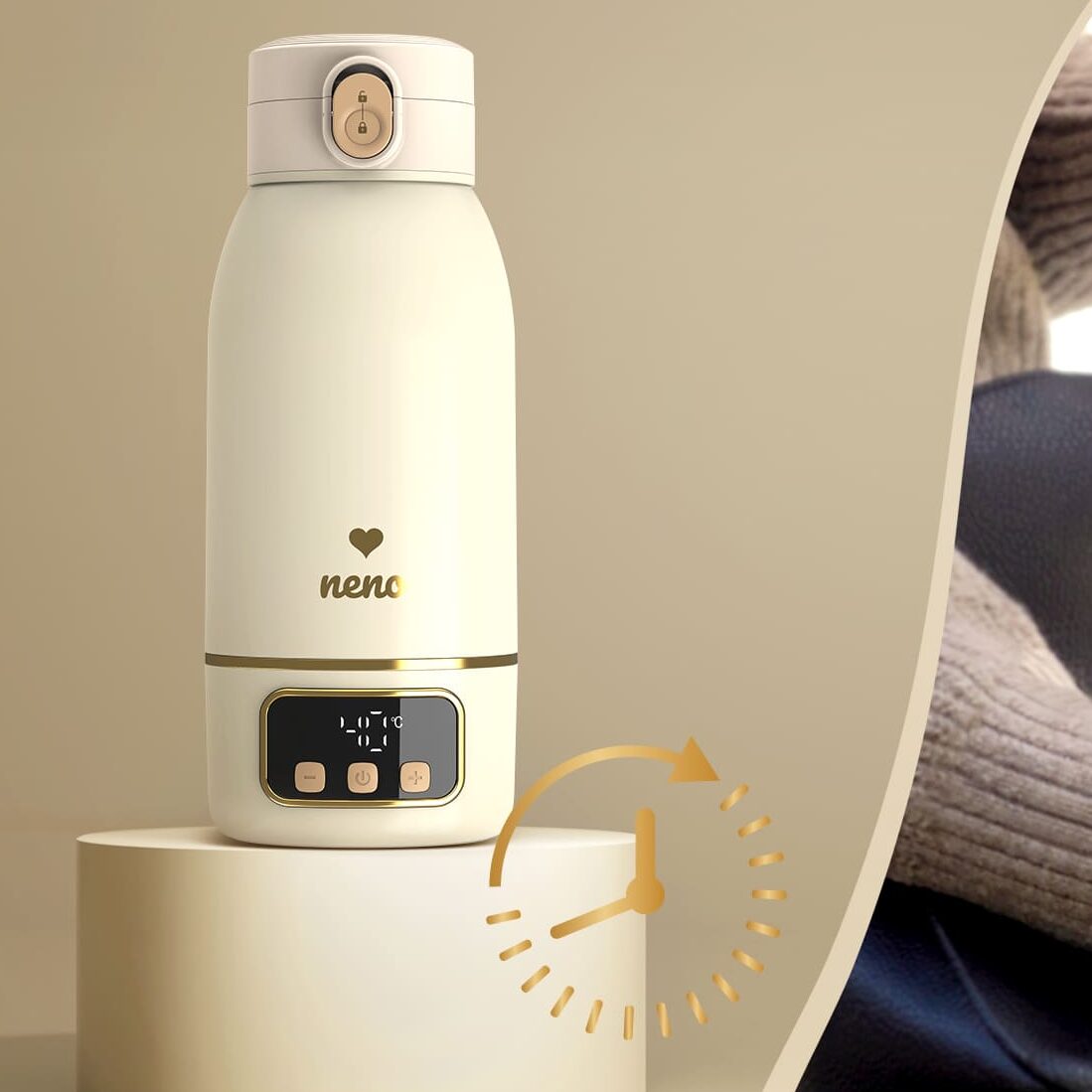 Neno Savia prenosni grijač je pametan i kompaktan uređaj za zagrijavanje vode i mlijeka, idealan za korištenje kod kuće ili u pokretu. Zahvaljujući elegantnom dizajnu, digitalnom displeju i preciznoj kontroli temperature, omogućava brzo i sigurno zagrijavanje tekućina za bebe – bilo da se nalazite u dnevnoj sobi, na izletu ili tokom noćnog hranjenja.
