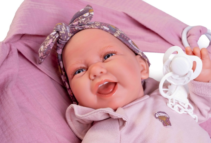 Njeno tijelo je napravljeno od mekog materijala kako biste je nježno mogli zagrliti, a lice i udovi su od mekanog vinila. Mjeri 42 cm i teška je 865 grama. Ona će se jako zabavljati s vama, gdje god je odveli! Može se postaviti u mnoge položaje kao prava beba jer se njeni udovi mogu rotirati, ima pokrete, što je čini realističnijom.