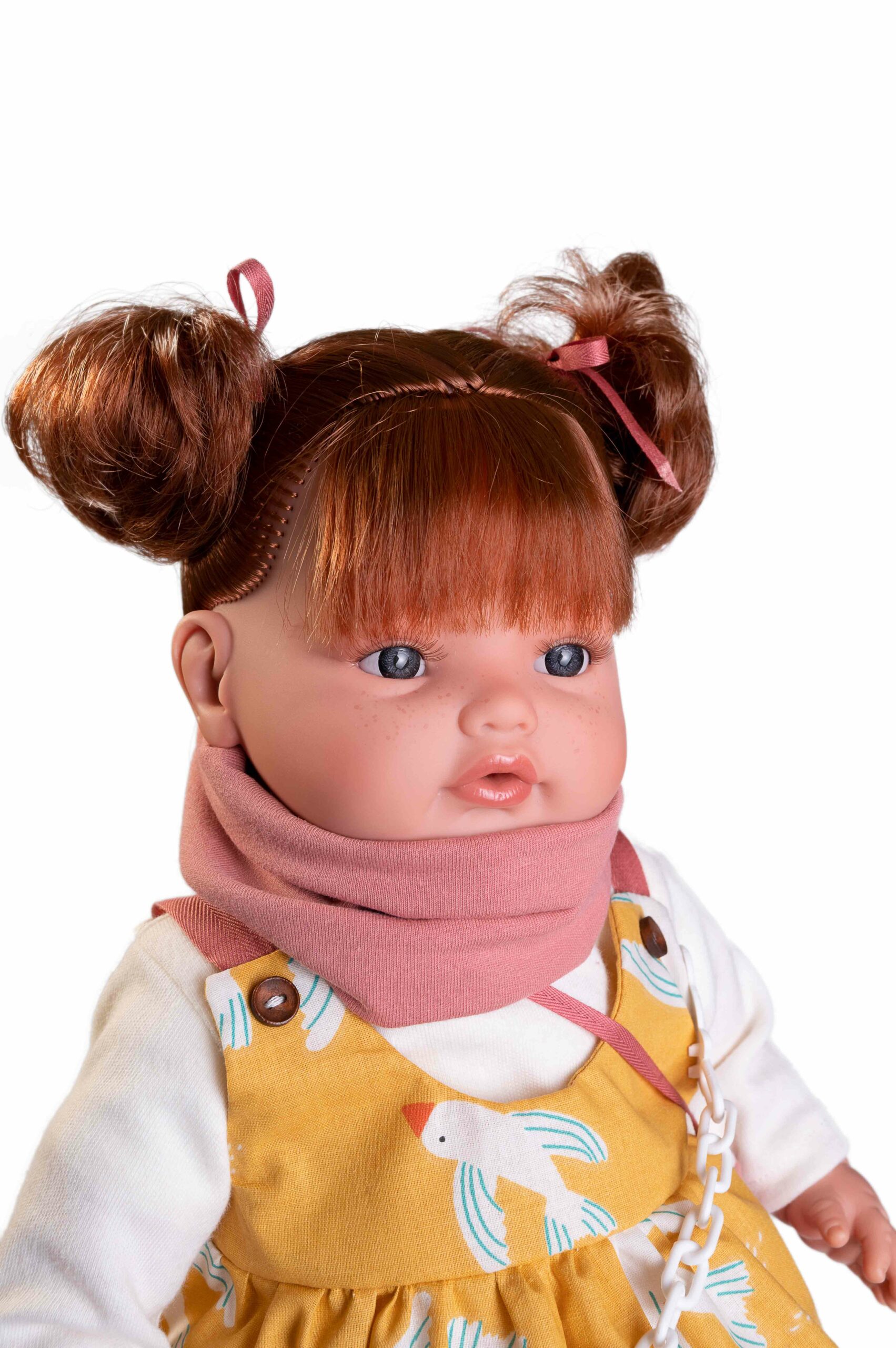 Antonio Juan lutka BENI je zaista lijepa u svojoj haljini senf boje s uzorkom malih ptica. Spremna je za šetnju s tobom, s torbom oko vrata. Njeno malo lice s crvenom kosom je vrlo zabavno.