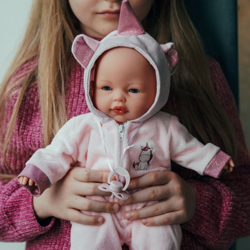 Antonio Juan lutka Bimba u mekanom kostimu jednoroga 37 cm očarat će vaše dijete čarobnim dizajnom i nježnim izgledom! Ova lutka dolazi s preslatkim mekanim kostimom jednoroga, idealnim za maštovitu igru i ulogu brižnog roditelja. Mekano tijelo i vinilni udovi savršeni su za zagrljaje, dok zvučni mehanizam donosi dodatnu dozu realizma – kada joj izvadite dudu, Bimba zaplače i poziva roditelje.