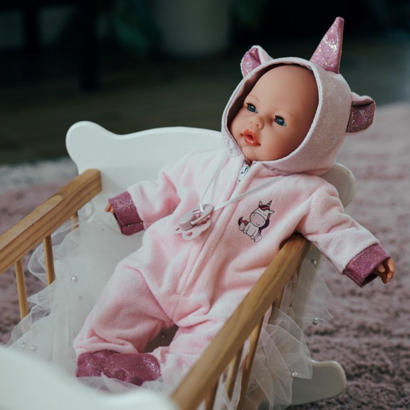 Antonio Juan lutka Bimba u mekanom kostimu jednoroga 37 cm idealna je za malu djecu koja vole igru uloga i nježnost. Zvučni mehanizam, kvalitetni materijali i pažljivo izrađeni detalji pružit će sate zabave i pomoći mališanima da razvijaju empatiju i ljubav prema igri.
