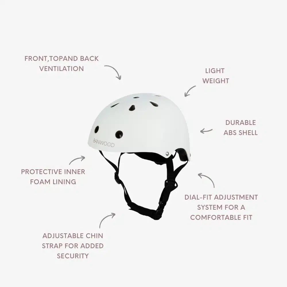 Banwood Kaciga je premium dječija zaštitna kaciga sa čvrstom ABS školjkom, unutrašnjom zaštitnom pjenom, dial-fit podešavanjem i ventilacijom, dizajnirana za sigurnu i udobnu vožnju na romobilu, balans biciklu, biciklu, skejtu ili rolama.