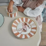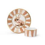 Ovaj ljupki porculanski set sa pozlaćenim rubovima i životinjskim otiscima kreiran je u ekskluzivnom i čvrstom  kvalitetu koji ih čini pogodnim za malu djecu. Tanjir i zdjelica mogu biti za svakodnevnu upotrebu ili za posebne svečane prilike.
