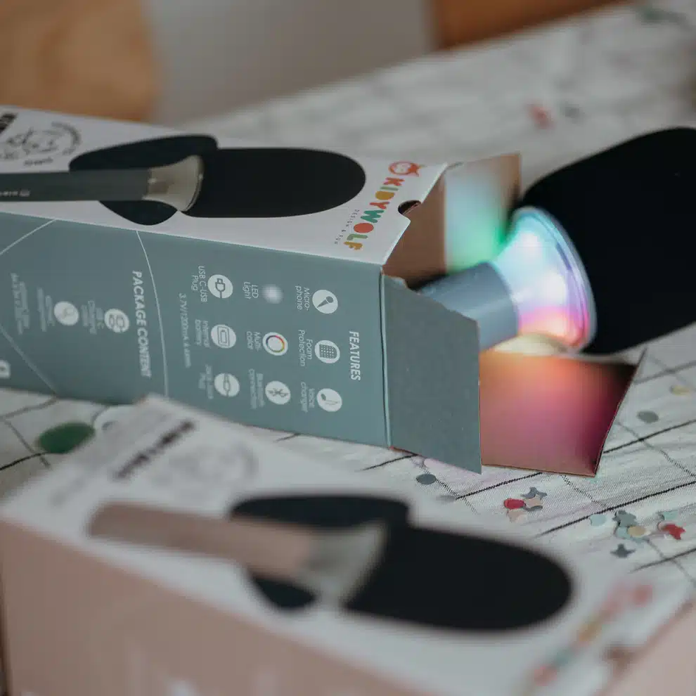 Kidywolf KIDYMIC Bežični karaoke mikrofon pretvara svaki trenutak u zabavan porodični nastup zahvaljujući mogućnosti reprodukcije muzike preko Bluetooth veze, ugrađenom zvučniku i efektima za promjenu glasa. Djeca mogu pjevati svoje omiljene pjesme, imitirati različite glasove i kreirati vlastite nastupe uz šarene LED svjetlosne efekte. KIDYMIC je lagan, bežičan i savršen za kreativnu muzičku igru kod kuće, u pokretu ili na rođendanskim zabavama.