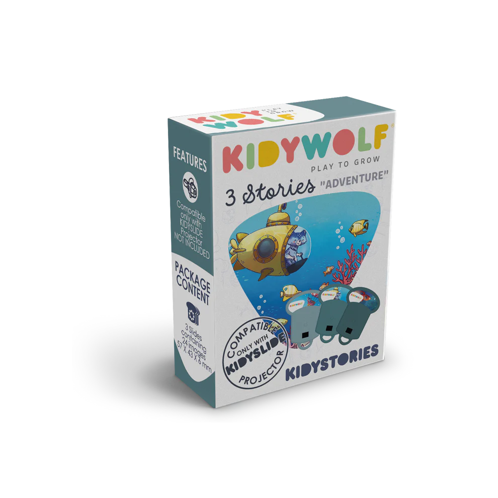 KIDYSTORIES kolekcija priča omogućava djeci da, pomoću KIDYSLIDE projektora, sami stvaraju uzbudljive priče i istražuju nove svjetove. „Adventure“ tema ih poziva da zakorače u imaginarne šume, pećine, gradove i planine, razvijajući pritom jezik, kreativnost i logičko razmišljanje.