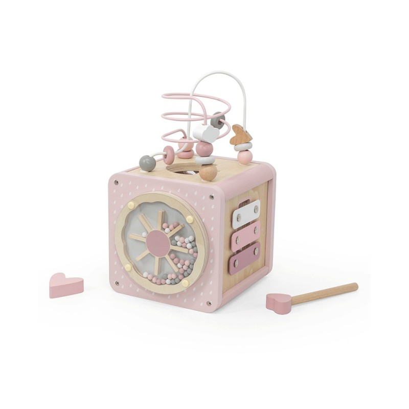 Label Label Drvena aktivnosna kocka 5-u-1 dolazi sa sorterom oblika, zupčanicima, labirintom, ksilofonom i žičanim labirintom sa perlama kako bi djeca bila maksimum angažovana.