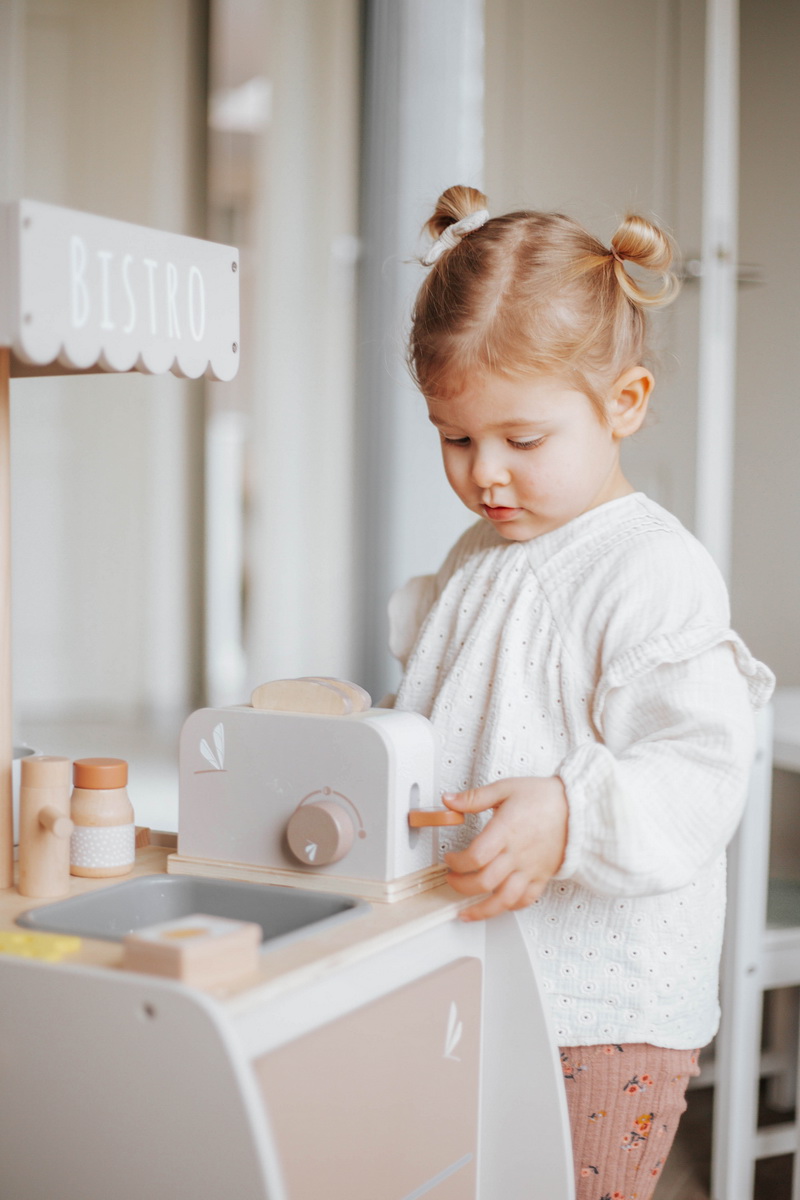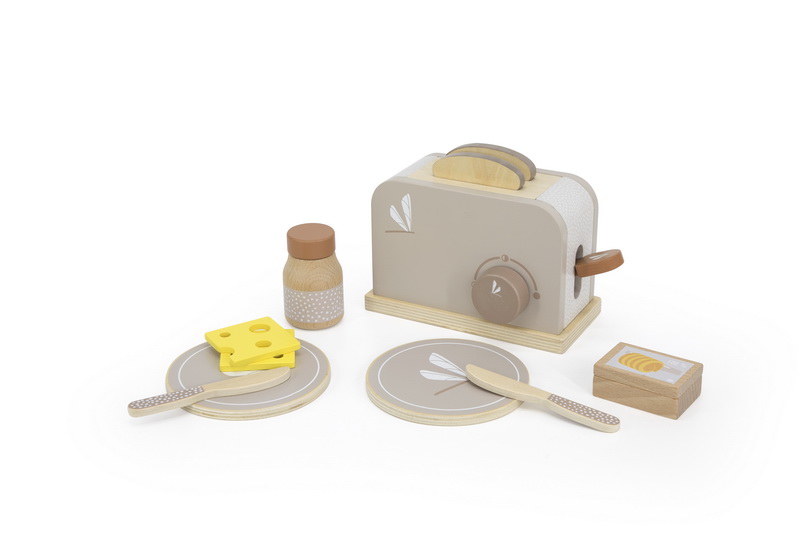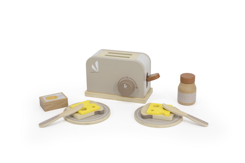 Ovaj prekrasan set upotpunjuje kuhinjsko posuđe vašeg djeteta. Od sada će se vaš mališan pobrinuti za nedjeljne marende. Sravite tost u toster, okrenite prekidač, pritisnite ručicu i vaš hrskavi zlatno-smeđi tost je spreman. Tost možete servirati na odgovarajućim tanjirima i noževima sa sirom, puterom i džemom/čokoladom/ koji su uključeni u toster.