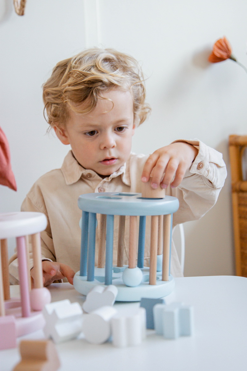 Umetnite različite drvene oblike u odgovarajuće rupe i pomaknite stupac s lopticom na njemu da biste uklonili oblike i ponovno se igrali. Pružit će djeci beskrajnu zabavu, poticati razvoj ne samo prepoznavanja oblika i boja, već i fino motoričkih vještina i spretnosti. Drveni točak potiče motorički razvoj beba, posebno kada ga pokušavaju kotrljati. Savršeno dimenzioniran za male ruke koje uče hvatati i istraživati.