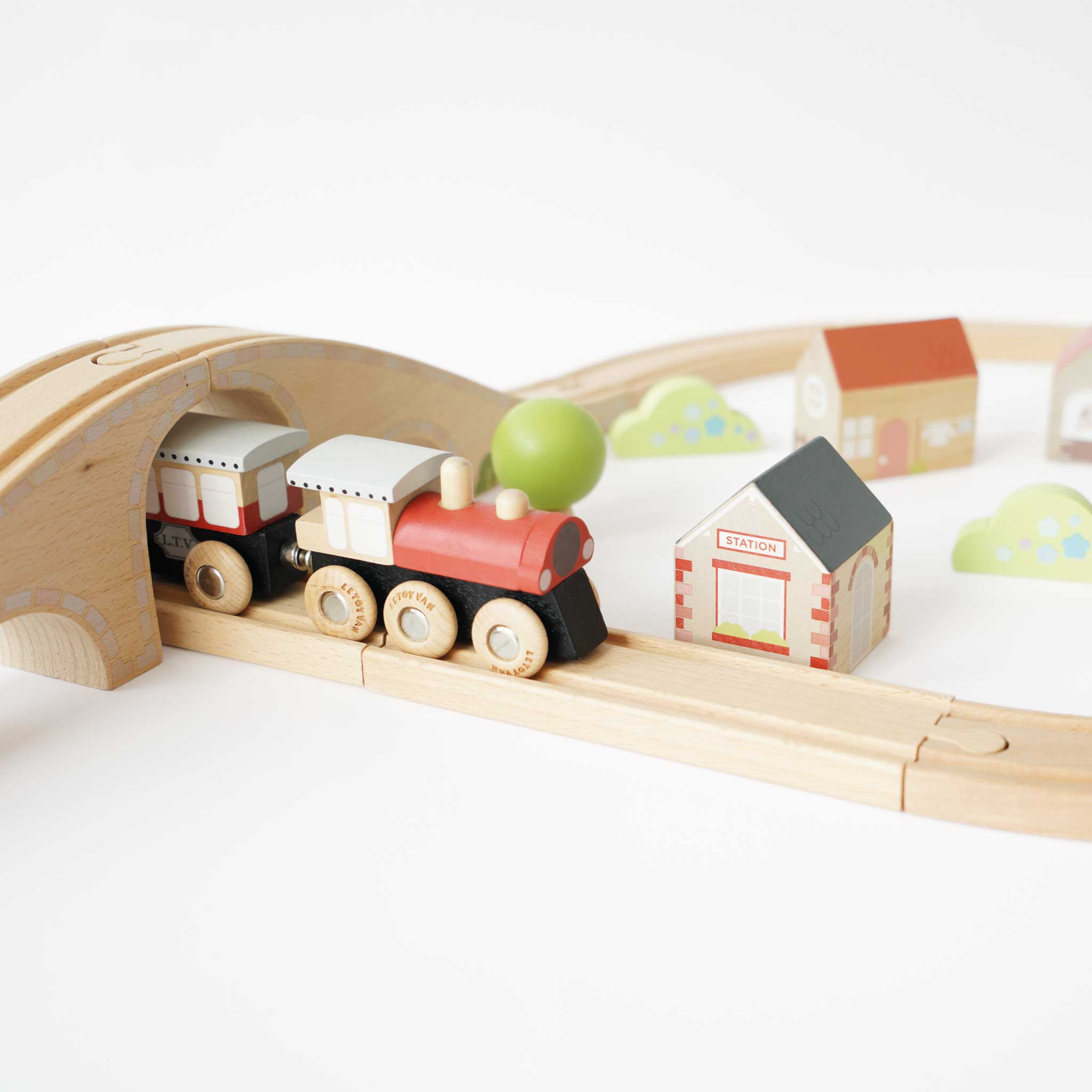 Ovaj prekrasan Le Toy Van drveni set vozića i drvena željeznička staza s gradskim motivima je prava čarolija i nezaboravno iskustvo za sve male ljubitelje željezničkih avantura.