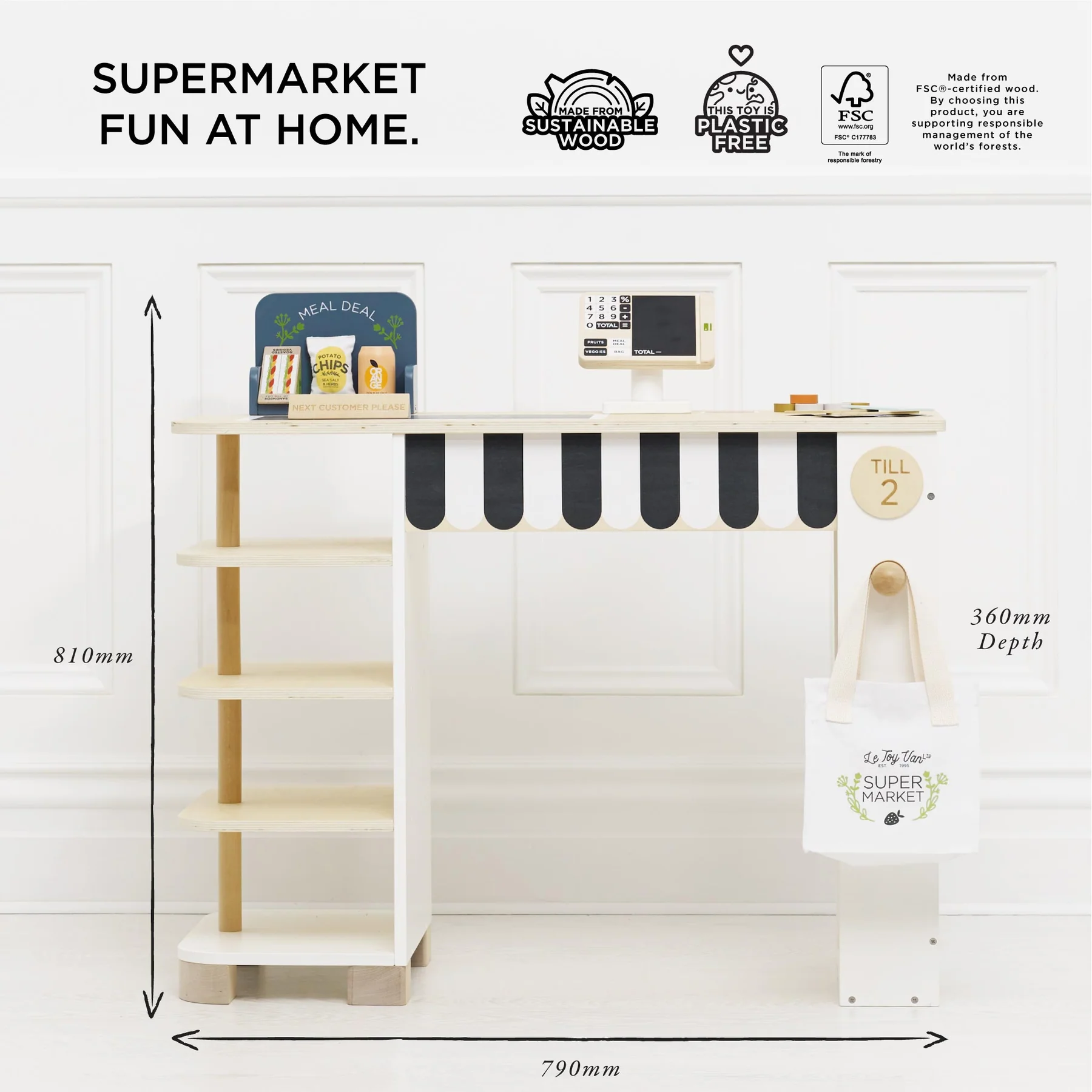 Spremite se za pravu kupovinu uz Le Toy Van drveni supermarket pult s blagajnom i dodacima! Ovaj mini supermarket pruža autentično iskustvo kupovine i omogućava djeci da kroz igru uloga razvijaju maštovitost, osnovne matematičke vještine i socijalne interakcije.