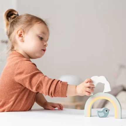 Igračka je izrađena od trajnog i održivog drveta i ne sadrži plastiku. Vrlo sigurna igračka, ukrašena netoksičnim bojama i testirana prema najvišim sigurnosnim standardima.
