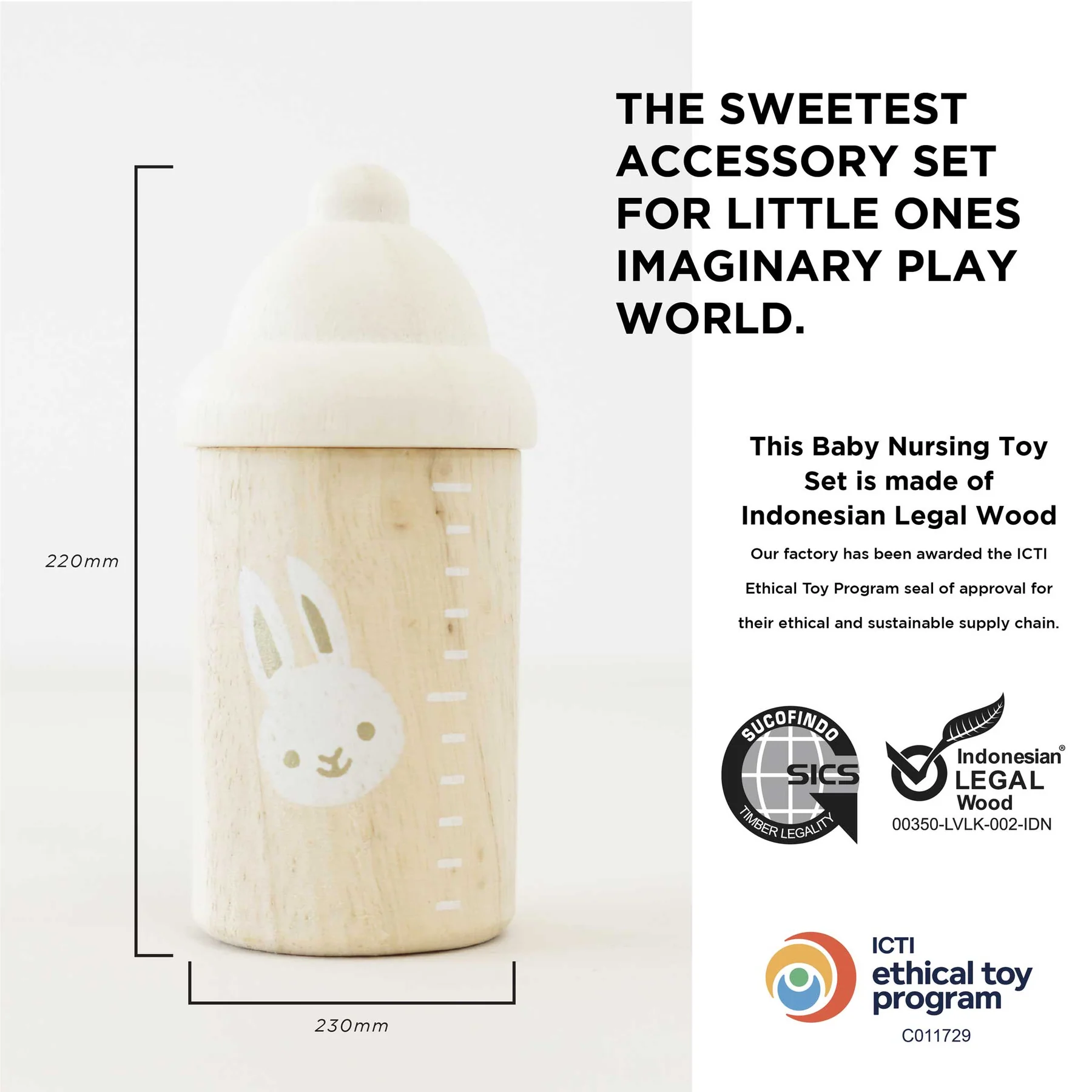 Ovaj set izrađen je s ljubavlju od kombinacije prirodnog pamuka i prekrasnog prirodnog punog drveta. Svi dodaci su prilagođeni lutkama i mekanim igračkama od 30-35 cm.