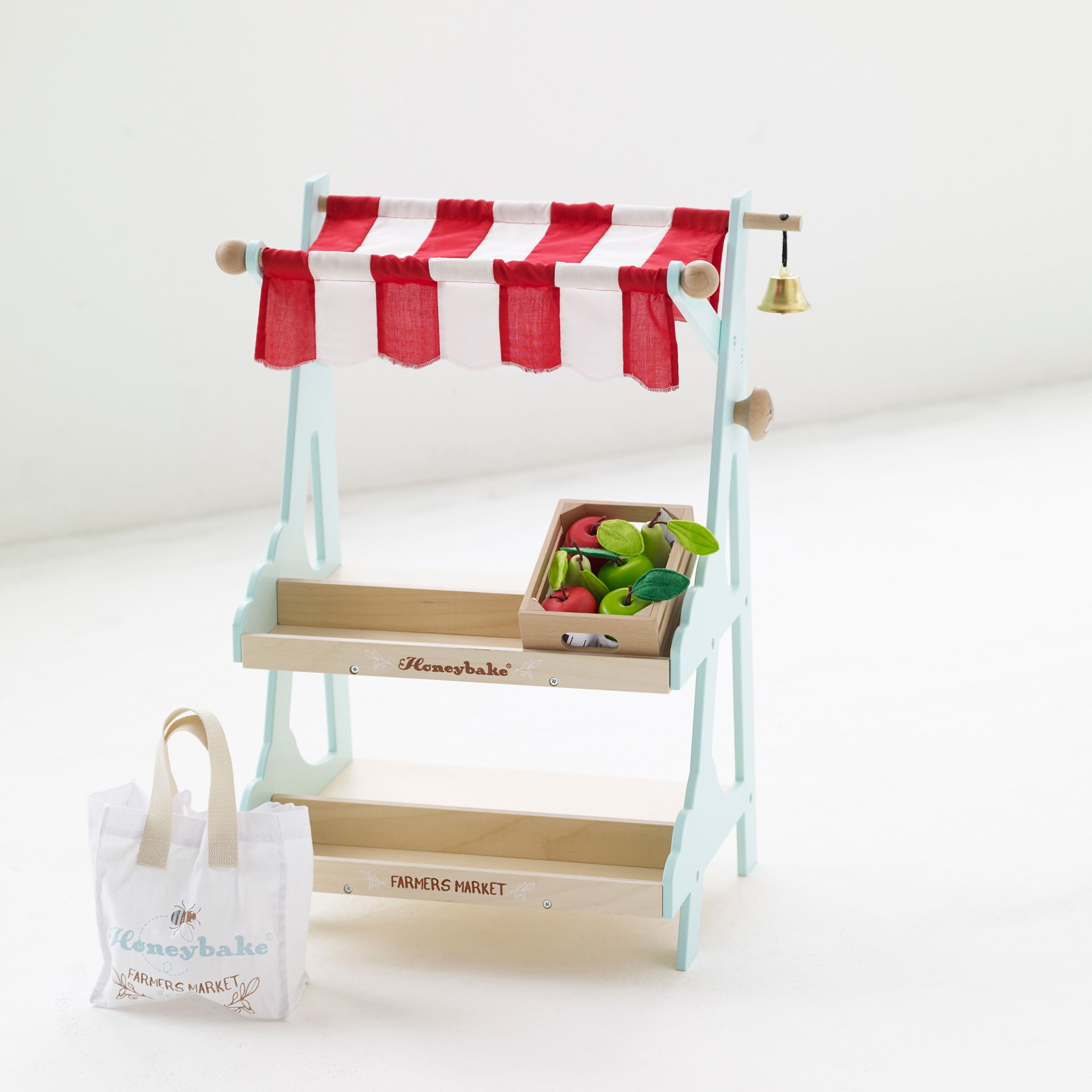 Ima prugastu tendu od tkanine koja se može pomicati, zvonce i mjesto za 6 drvenih kašeta po vašem izboru. Uz ovu tržnicu dolazi gajba jabuka i vrećica od tkanine da vaši mališani imaju gdje staviti sve svoje stvari.