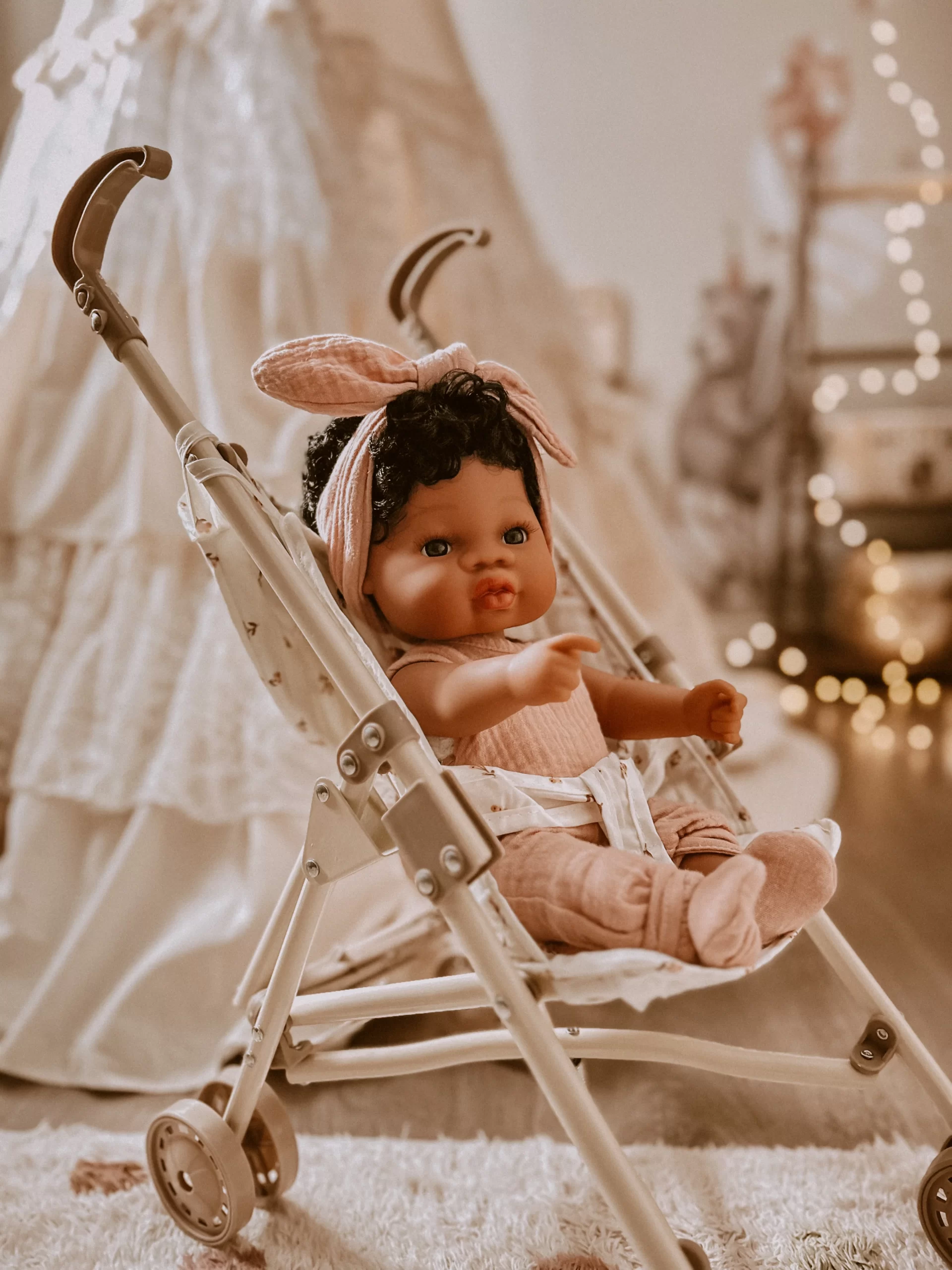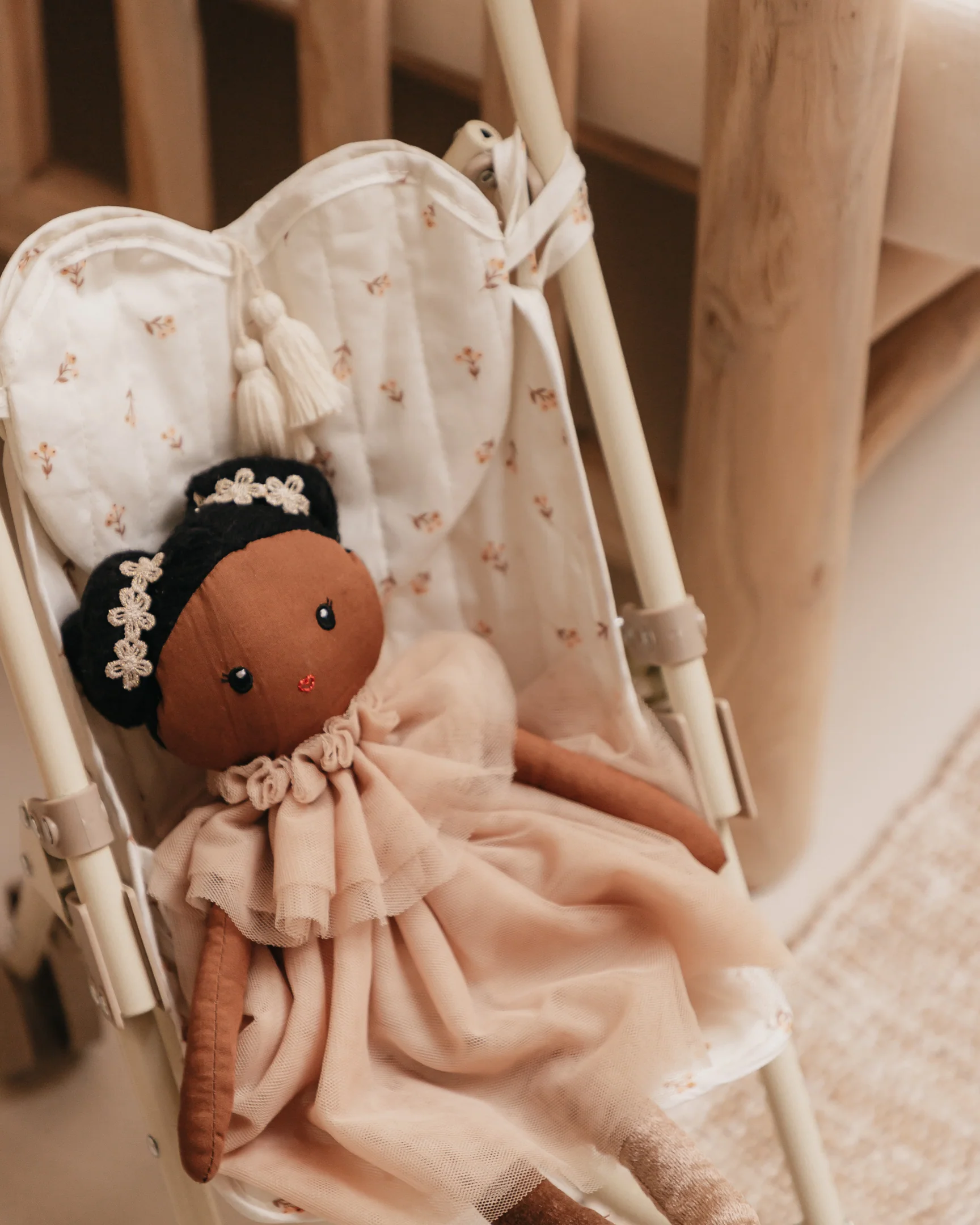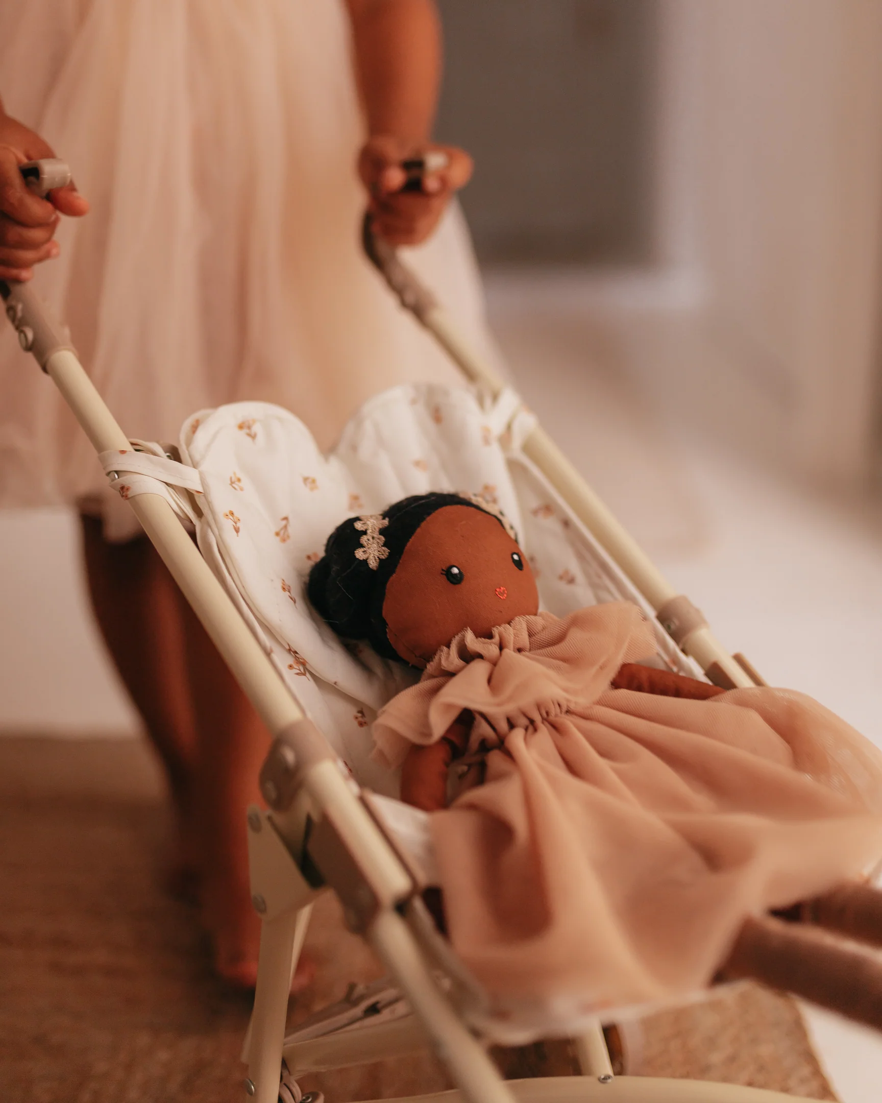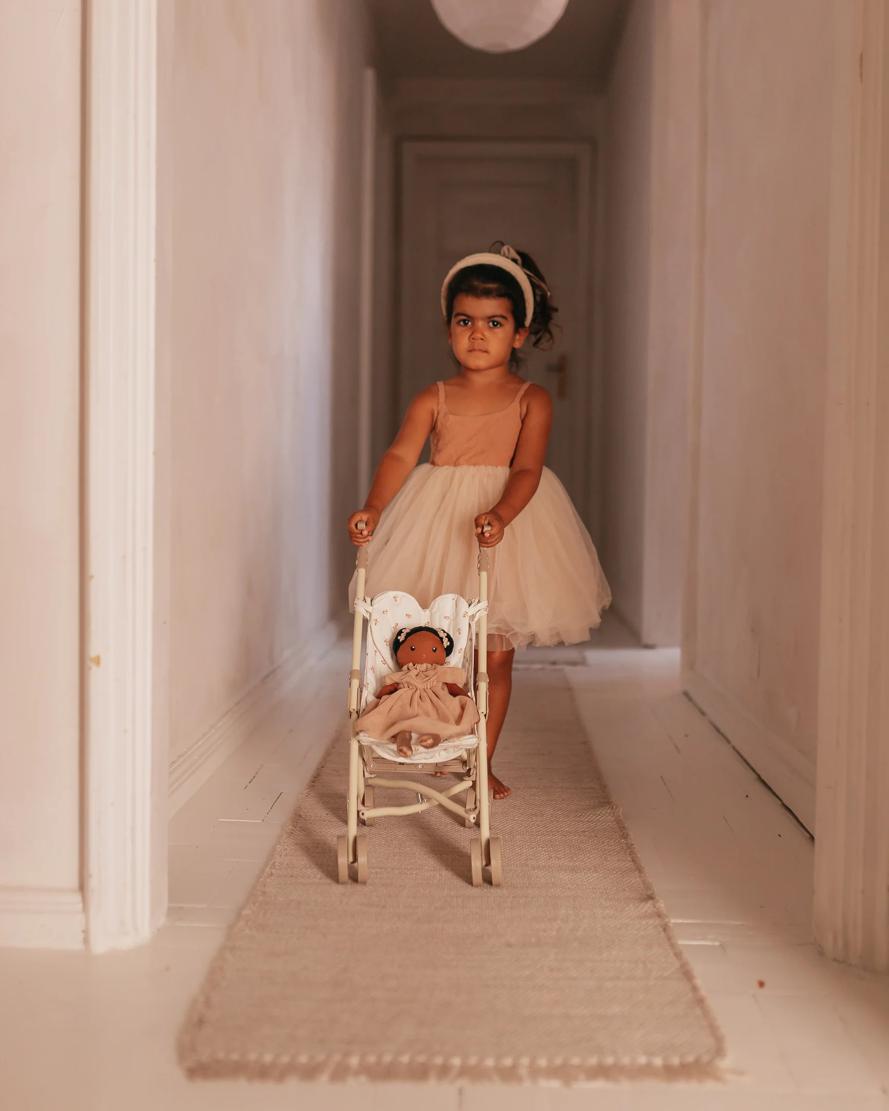 Mrs Ertha kolica za lutke spoj su nježnog retro dizajna i praktičnosti, izrađena od organskog pamuka i metalne konstrukcije za čvrstoću i stabilnost. Namijenjena su lutkama do 36 cm dužine, savršena za sve male mamice i tate koje vole šetati svoje omiljene igračke.