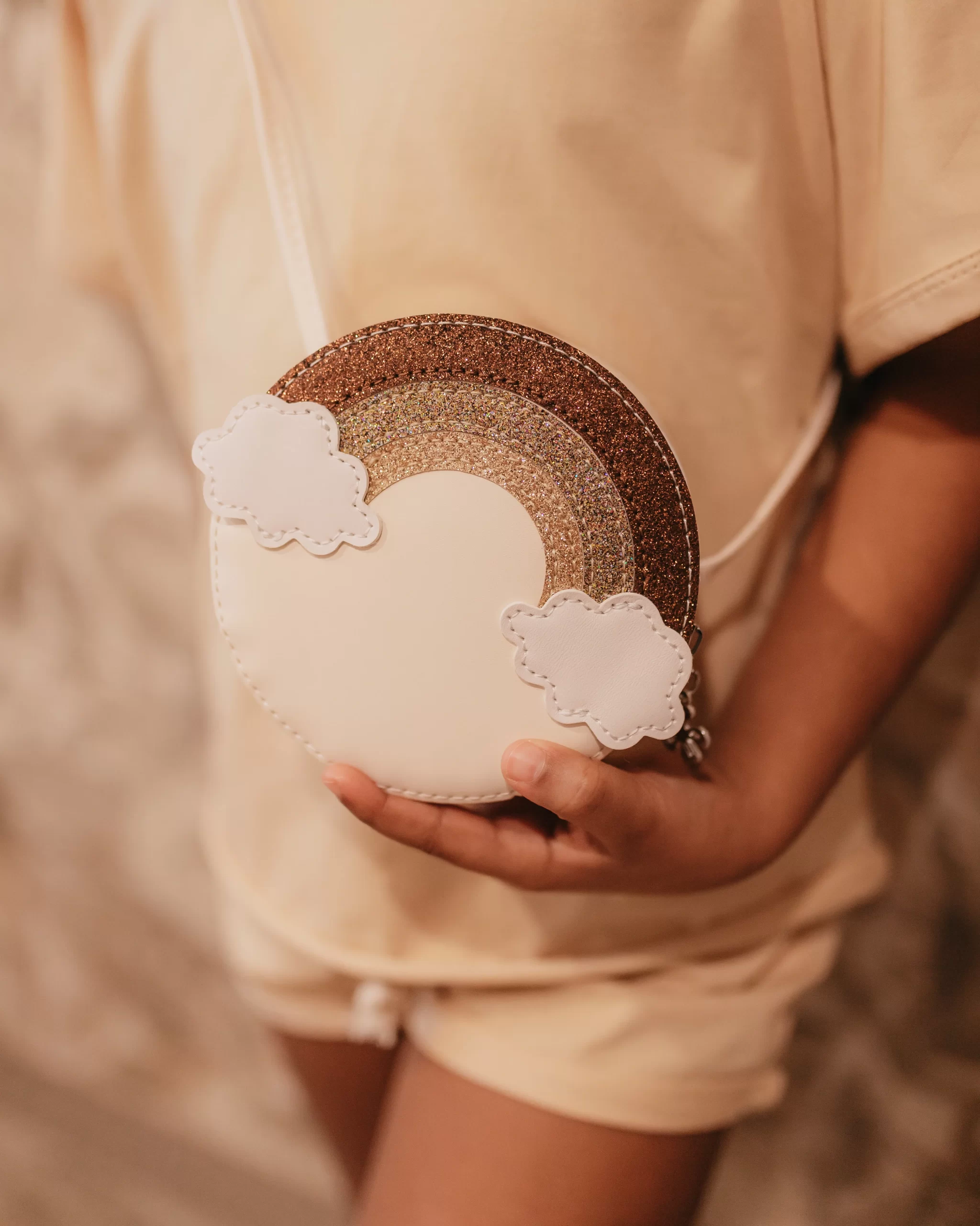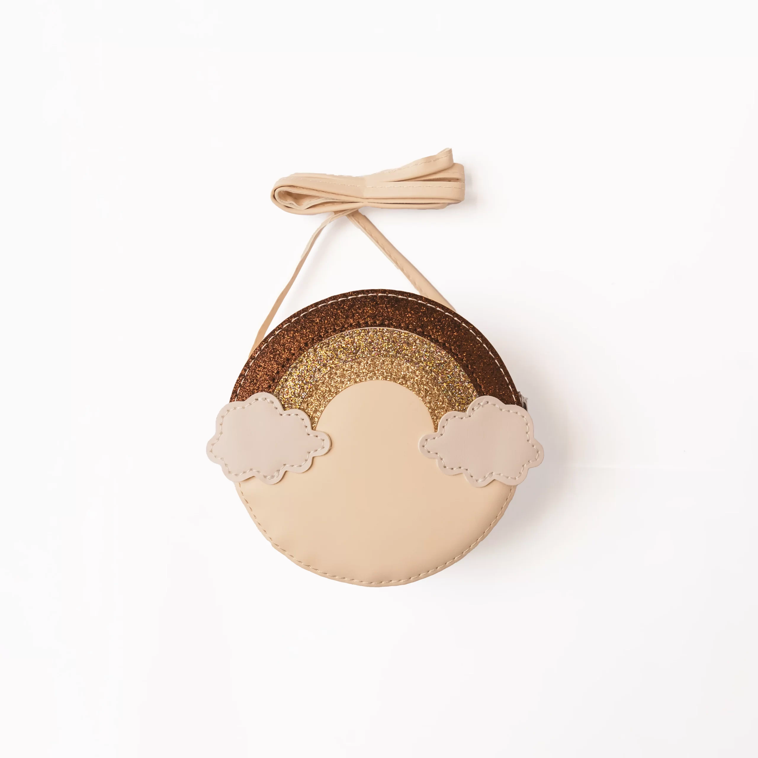 Mrs Ertha mini torbica u obliku duge izrađena je od eko kože (PU) i ukrašena šarenim sjajnim detaljima koji podsjećaju na zlatnu dugu. Uz preslatke oblake i praktičan rajsferšlus, ova torbica donosi dozu radosti u svaki dan vaše djevojčice.