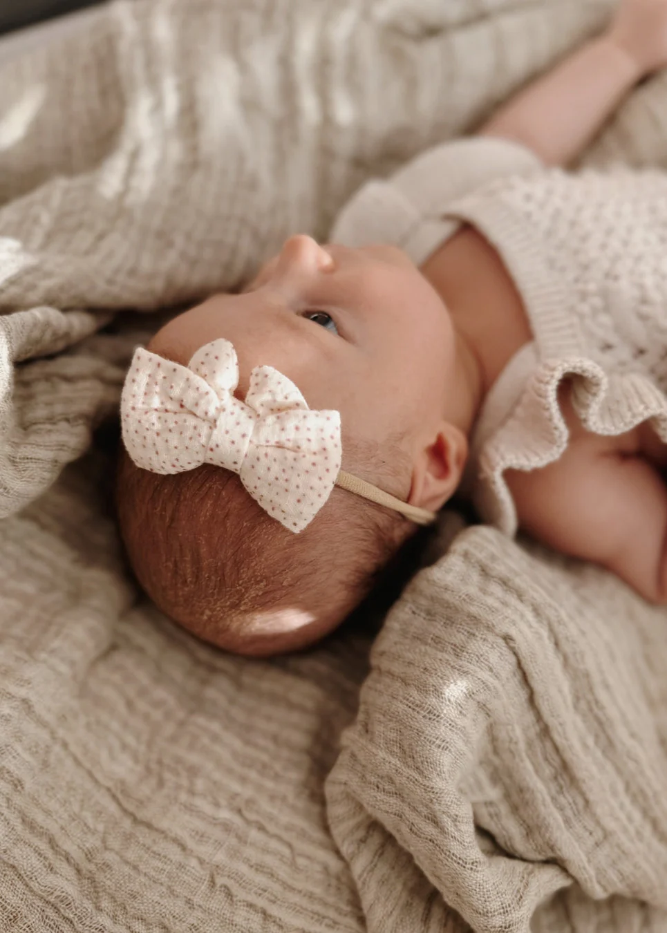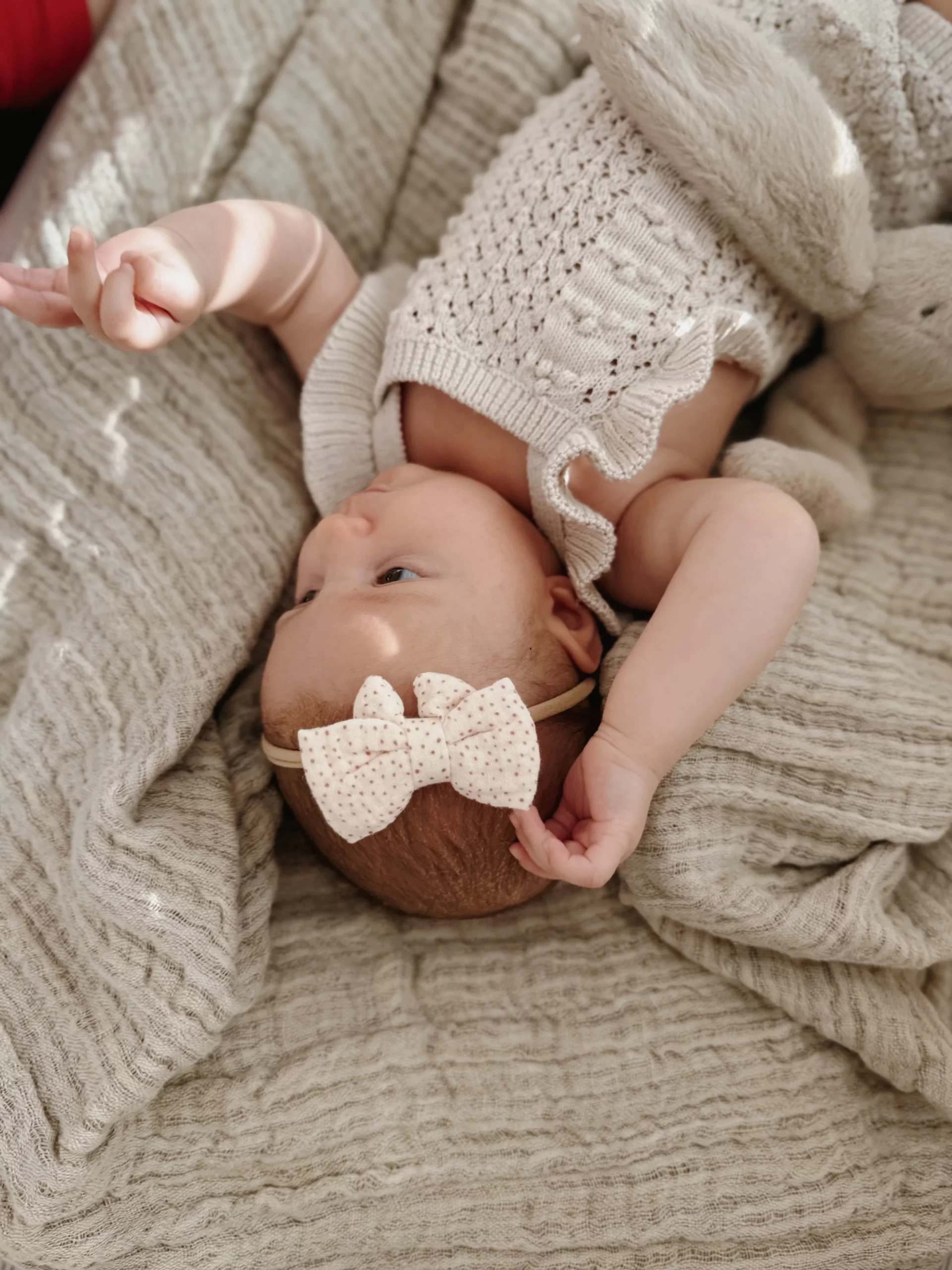 Mrs Ertha traka za kosu s mašnom je savršen spoj udobnosti, stila i sigurnosti – diskretan i elegantan detalj za najnježnije dječije dane.