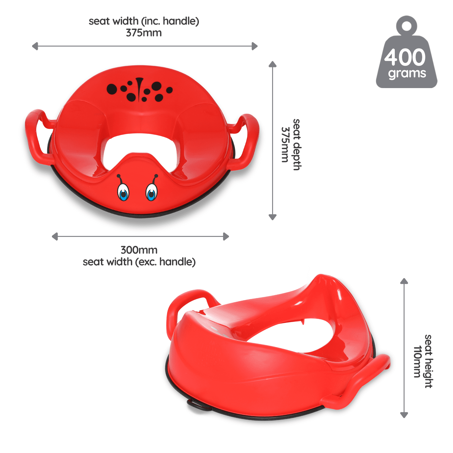 Prilagođeno je većini toaleta – wc školjki, s velikim udobnim sjedalom, dodatnom podrškom s leđa i ručkama za stabilnost, tako da se vaše dijete ispravno postavi na toalet, osjećajući se sigurno i udobno. Posjeduje visoki štitnik na prednjem dijelu kako bi se spriječilo prskanje.