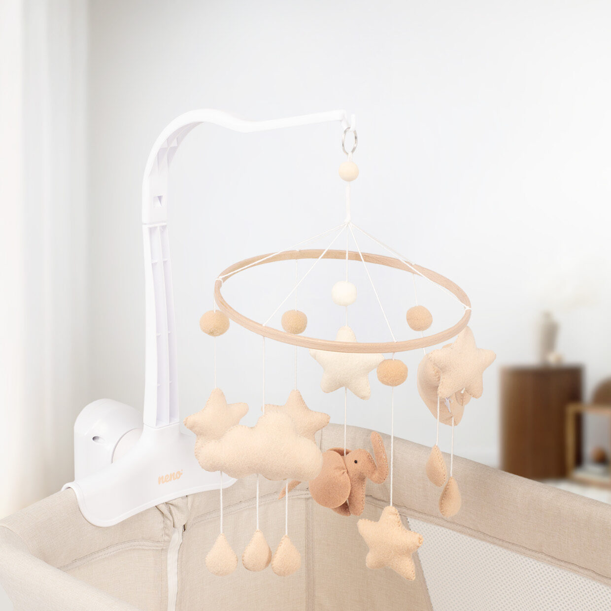 Neno Eli – Vrtuljak za krevetac s držačem je predivan dodatak svakoj dječijoj sobi, dimenzija 24 × 40 cm, pažljivo dizajnirane plišane maskote i sigurnu montažu.