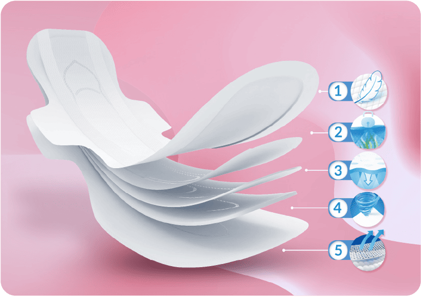 - ● 5-slojna zaštita sa poroznom gornjom površinom za brzo upijanje i suhoću