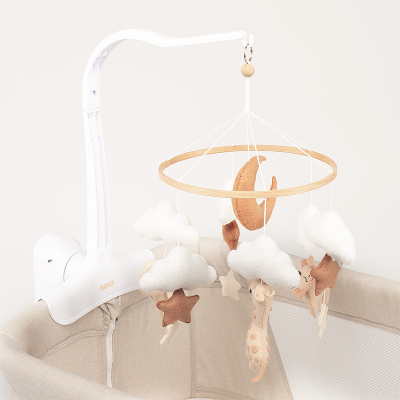 Neno Tedi – Vrtuljak za krevetac s držačem je nježno dizajnirana vrteška dimenzija 24 × 40 cm, koja kombinuje savremeni dizajn, sigurnost i pažljivo birane materijale kako bi obogatila svakodnevicu novorođenčeta i olakšala prve mjesece roditeljima.