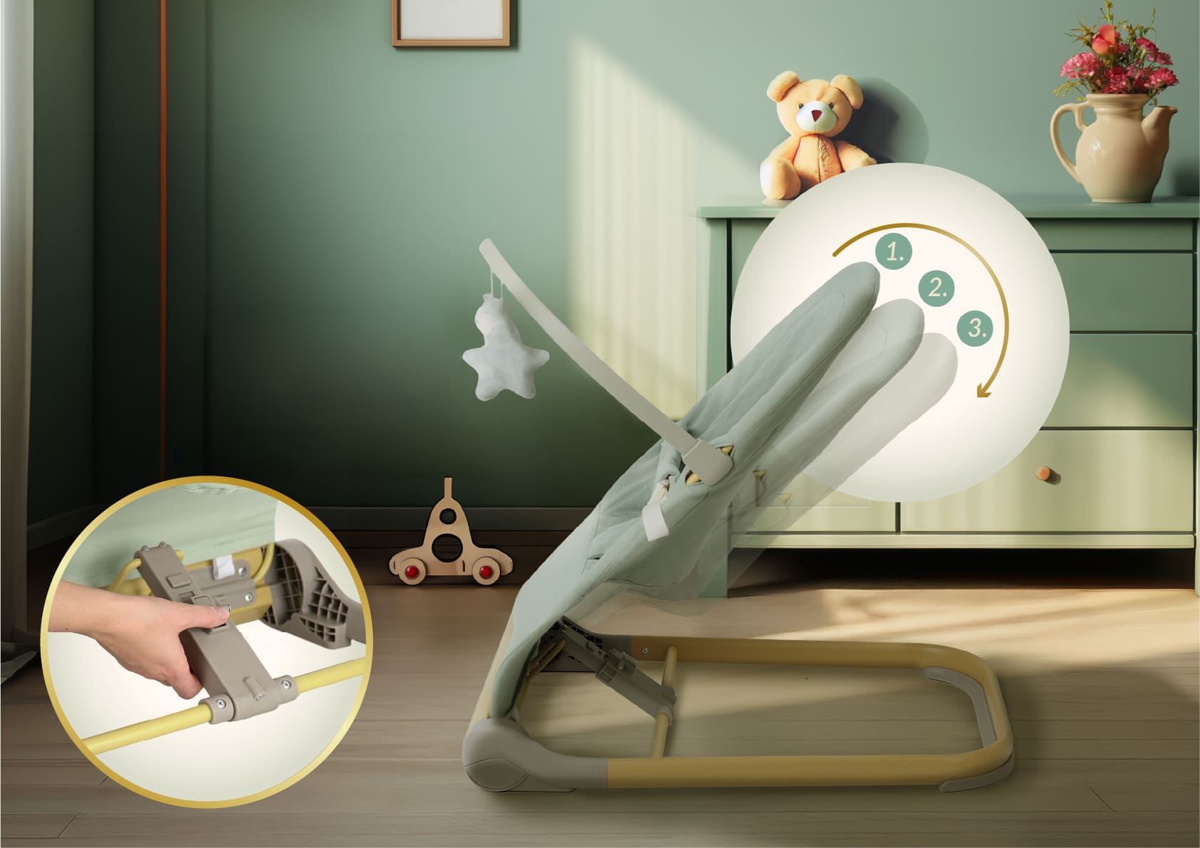 - ● Prirodno njihanje – pokreće se blagim pokretima bebe, bez baterija