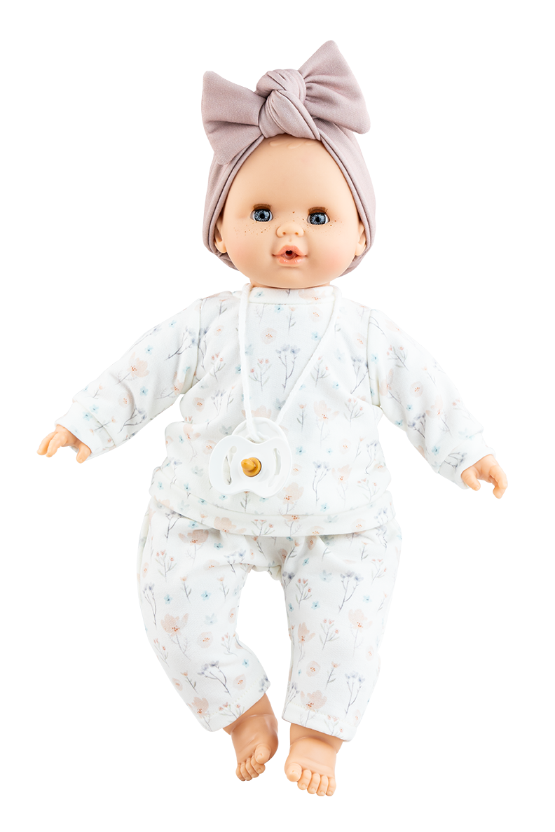 Sonia nosi preslatku dvodijelnu pidžamicu s nježnim cvjetnim uzorkom, u kombinaciji sa modernom turban mašnom, što joj daje poseban šarm. Uz lutku dolazi i bijela duda na trakici, čime se dodatno podstiče igra njege i brižnosti.