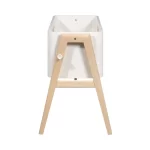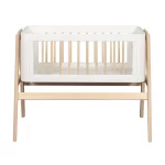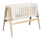 Stilizirana ljuljajuća kolijevka u bijeloj boji s prirodnim okovima, koja pruža blagi pokret ljuljanja. Ovaj pokret može se lako zaključati pomoću stop štake, čime kolijevka postaje stabilna.