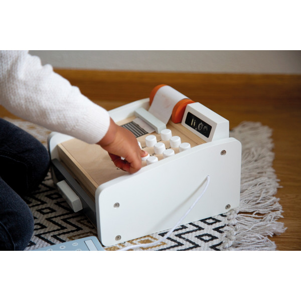 Unesite iznos pritiskom na tipke, zapišite ga kredom na zaslonu ili na priloženi papirnati račun. Kupac može platiti drvenim novcem ili drvenom karticom putem pos uređaja. Blagajna ima ladicu u koju možete staviti sav novac. Novac je ukrašen simpatičnim životinjama.