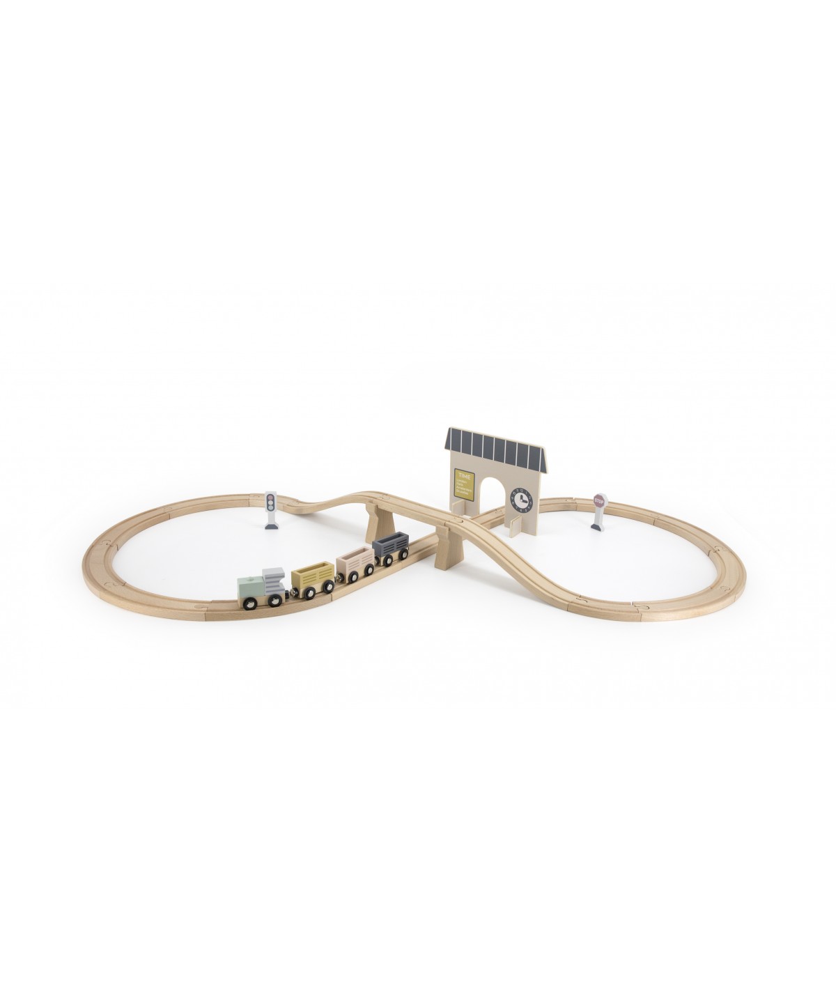 Tryco Drveni željeznički set – vozić, stanica i tračnice je praktičan set kojim će oživjeti dječija mašta. Ovo je osnovni vozni komplet koji se sastoji se od lokomotive i tri vagona, saobraćajnih znakova, stanice i 18 komada pruge uključujući i most!